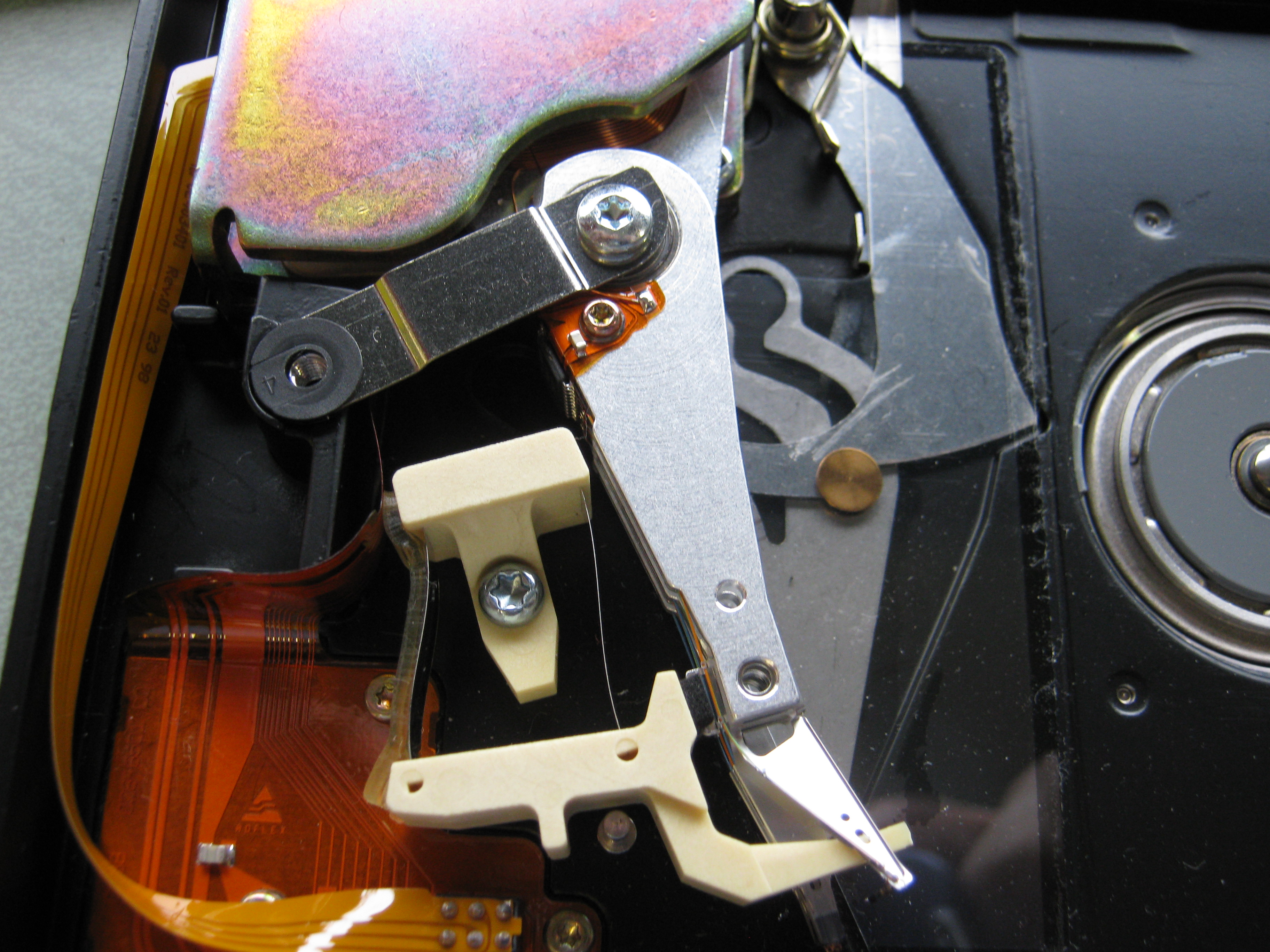 Although this bulkier, larger, lower capacity technology was tolerant to some DIY data recovery efforts, the Jaz drive seems pretty vulnerable during normal use. The act of essentially jamming platters in and out of an open hard drive creates problems, and the Jaz system has limited ability to keep out contaminants over time. When we were testing the University’s supplied Jaz drive, we found one simply had a mangled read/write head. The internet suggests that this was common when you forced a disc to eject. The edge of the platter simply caught the read/write head assembly and bent it.