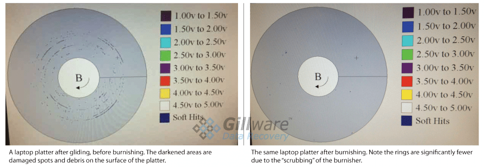 Our hard disk platter burnisher is based on the same technology used by hard disk drive manufacturers to polish platters on the factory floor. The burnishing technology in our lab plays an instrumental role in salvaging data from extremely damaged hard drives. Severe platter scratches and rotational scoring scatter dust across the platter surfaces. In order to salvage the remaining data from these platters, our engineers must clean the dust off first. Platter burnishing is the most effective way to accomplish this.