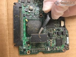 Inspection of the interior components of the three hard drives revealed that the corrosive substance hadn’t caused much damage to the data storage platters. This was a relief for all of us here at Gillware. However, the drives’ read/write heads hadn’t been so lucky. A small amount of corrosive fluid had seeped into the hard drives, complicating this RAID-5 server recovery effort. The fluid had eaten away at the read/write heads’ preamp connections. Each drive had to have its magnetic read/write heads replaced.