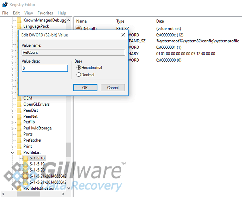 When you’ve found the correct folder, double-click on the “State” entry and the “RefCount” entry and change the values in both to 0. Once you restart your computer, you should be able to log into your user profile: