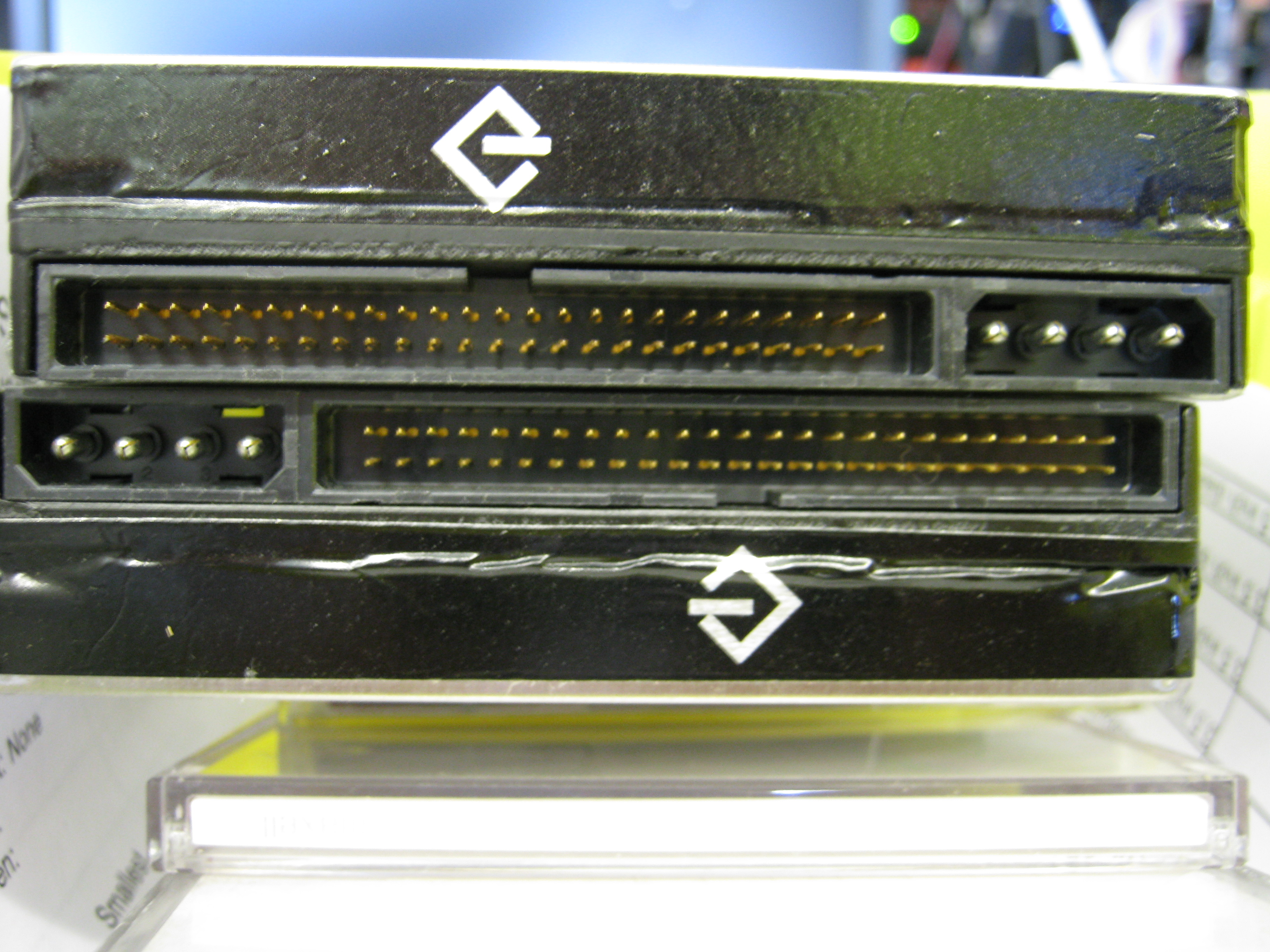 For people interested in hard drives, they are a nifty technology. They break so many rules of what a hard drive is supposed to be. An Iomega Jaz system is essentially a hard drive that comes apart in two pieces – the platter assembly is one piece; the drive is the other. The drive itself is the motor, control board, motor, and read/write head assembly. It’s what bolts into a desktop computer. The removable disc or cartridge holds two silvery round platters inside its square-ish plastic shell.