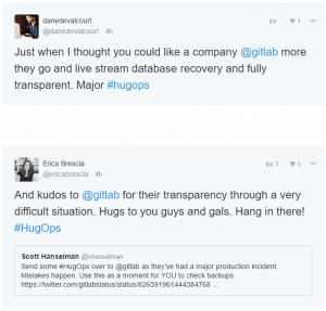 But the public response to GitLab’s situation has been incredibly sympathetic. Within a few hours of the incident, programmers and IT professionals started expressing their sympathy and condolences, as well as their admiration for GitLab Inc’s honesty and transparency, using the hashtag #HugOps. It was beautiful—like watching the town come together to help George Bailey at the end of It’s a Wonderful Life. When GitLab came back online, the response was overwhelming: